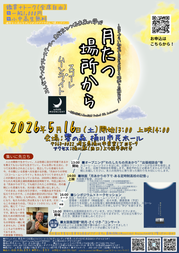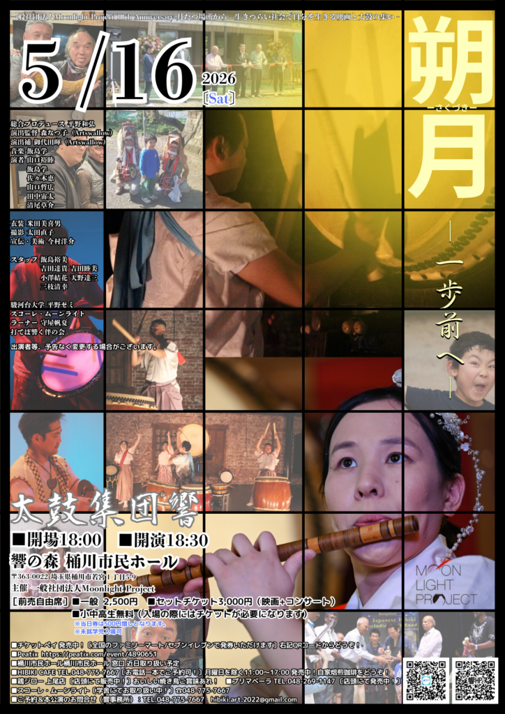 5月16日、月たつ場所から‐生きづらい社会で自分を生きる映画と太鼓の集い‐と題しまして、映画上映会と太鼓集団響のコンサートを開催いたします。